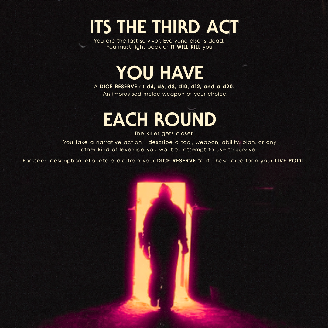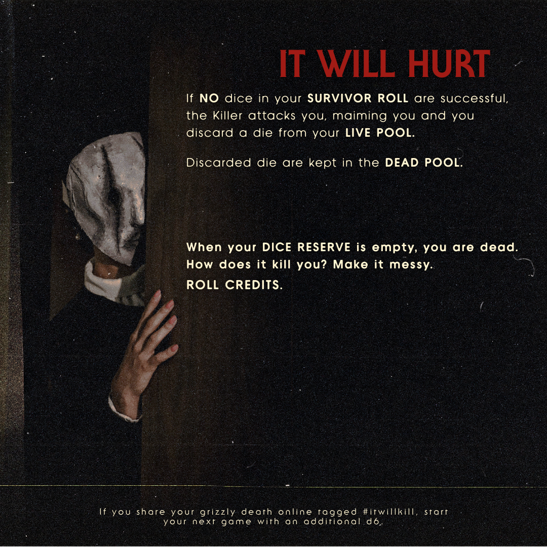 IT WILL KILL is a solo or duet game about the third act of a slasher movie. Everyone is is dead, only you remain. You have no choice but to fight back. If you don't - IT WILL KILL.